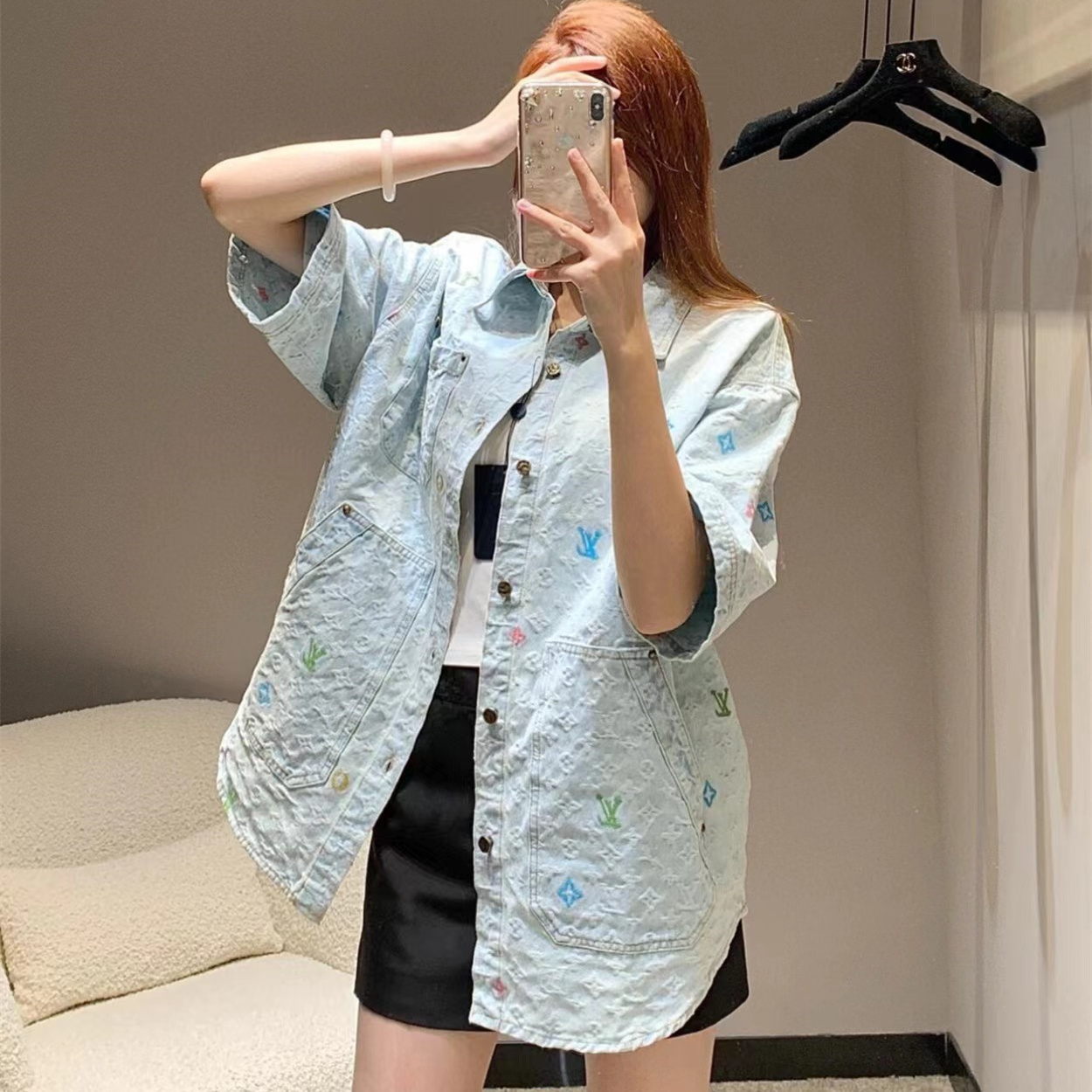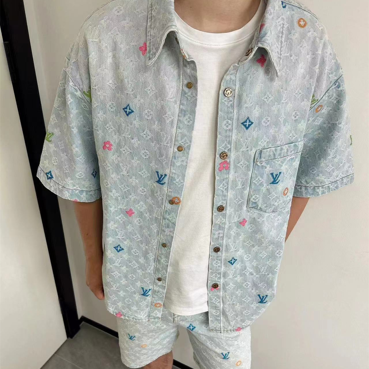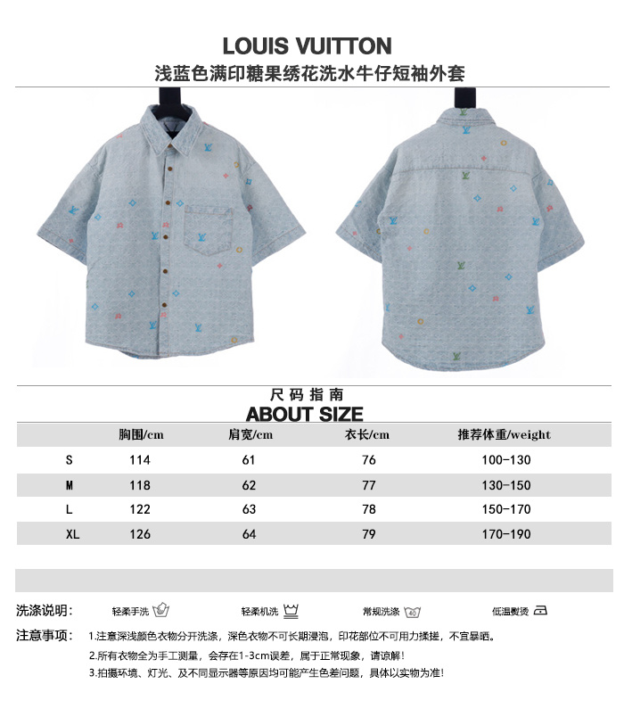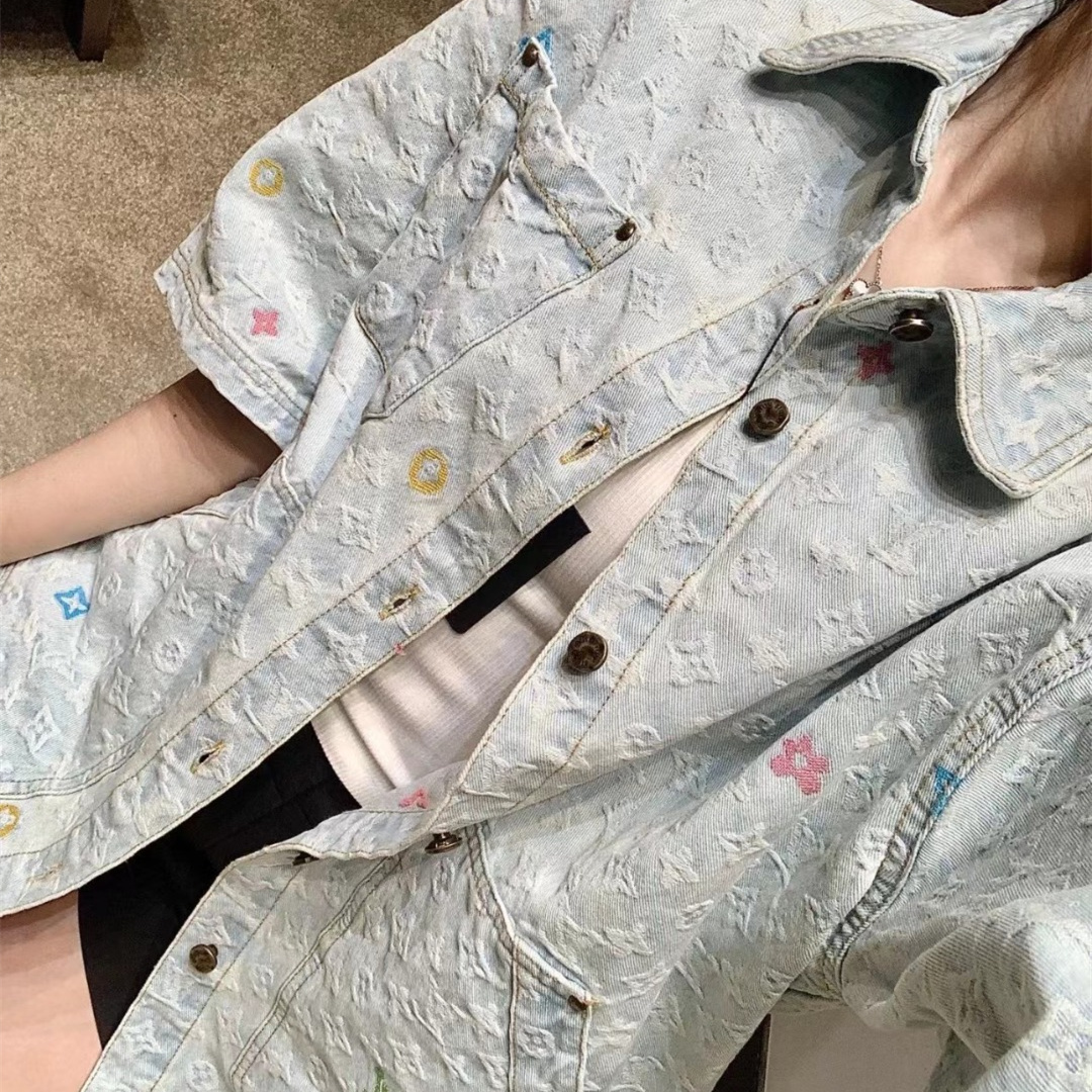 LOUIS VUITTON/路易威登淺藍色滿印糖果繡花洗水牛仔短袖外套.全幅 Monogram Craggy提花,點綴剪花細節,做舊金屬刻字紐扣開合門襟,下擺圓弧剪裁細節.