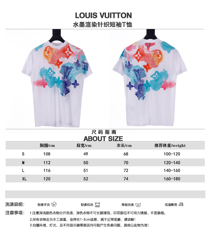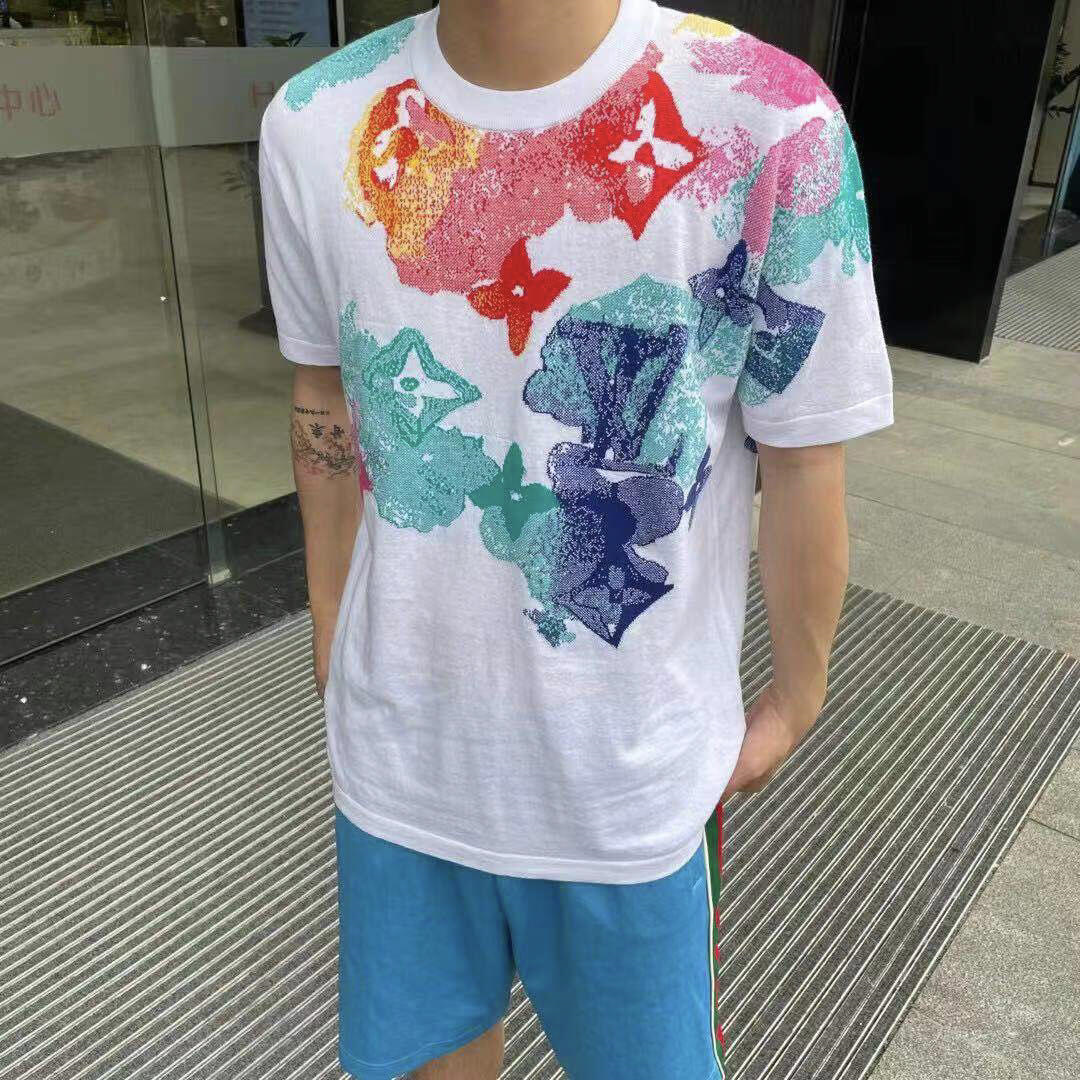 Louis Vuitton路易威登SS21水墨渲染針織短袖T恤.此款面料采用支數海島棉紗線,整衣使用了9種定染的紗線由托爾斯16針12紗嘴嵌花機器8色嵌花單件織造時間400分鐘,整體花型調整耗時2個月時間開發,工藝尤為覆雜 ,人工耗損時間成本相對於一般的款式要覆雜 .