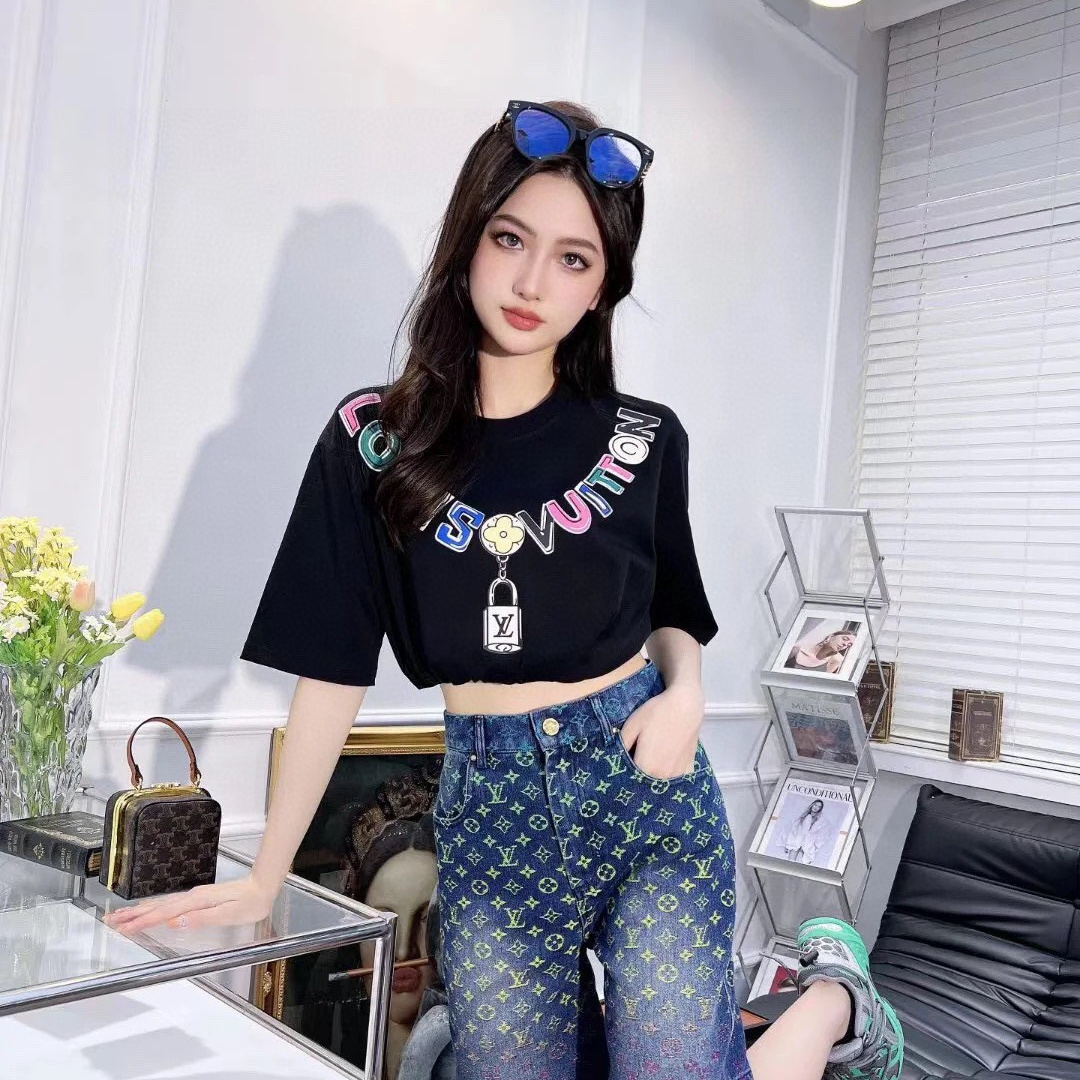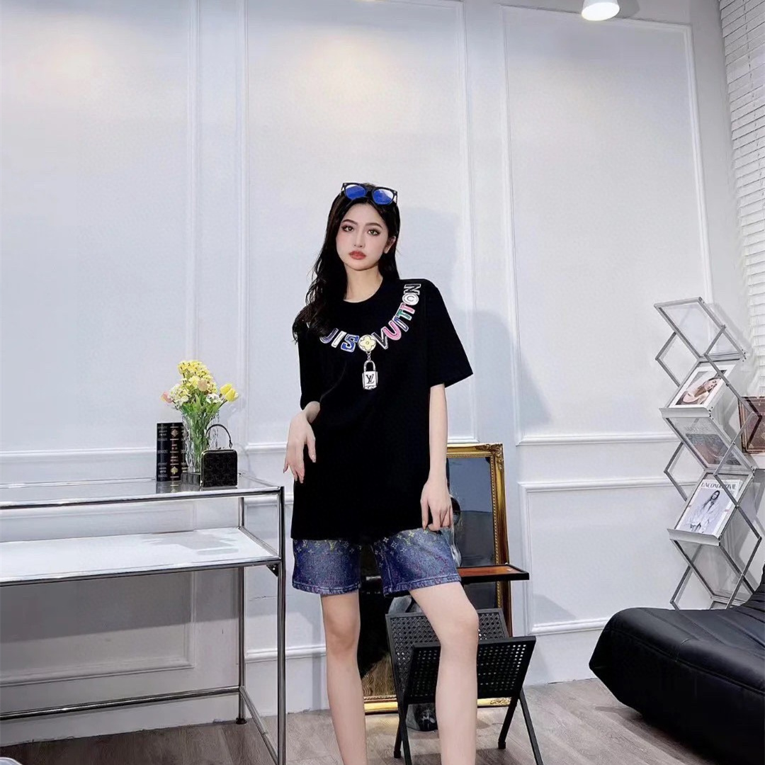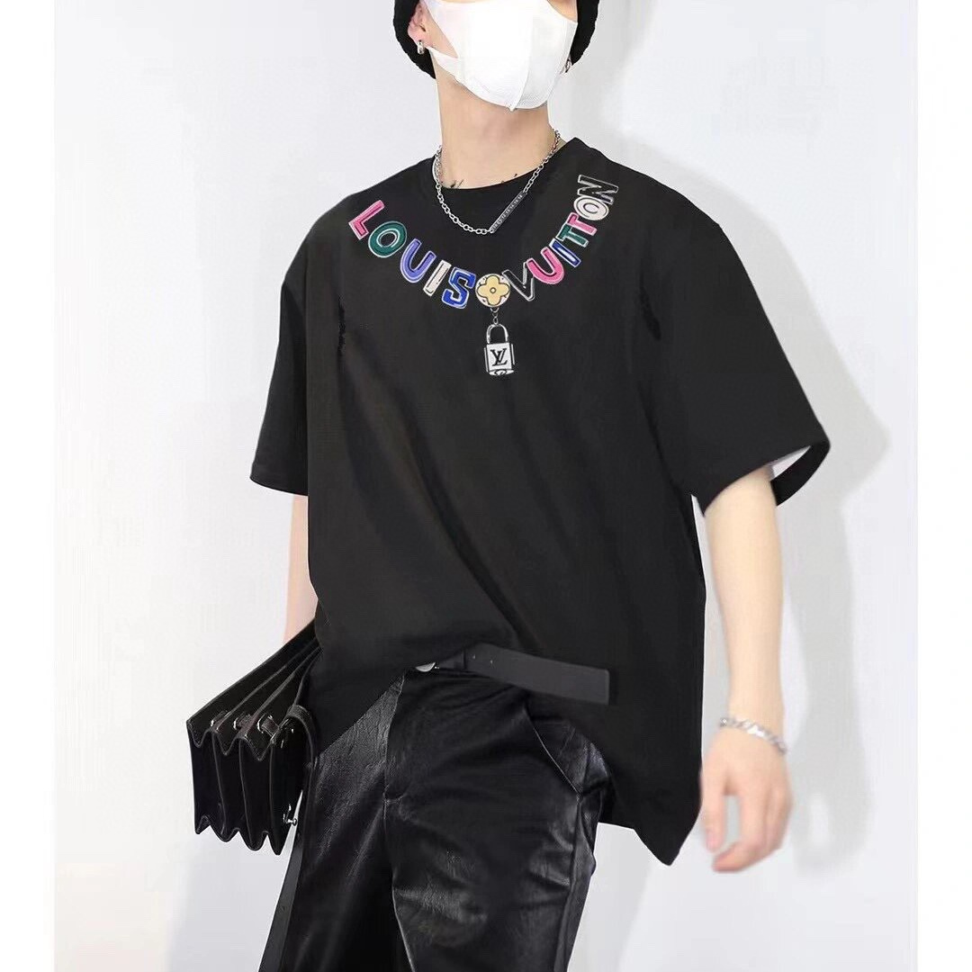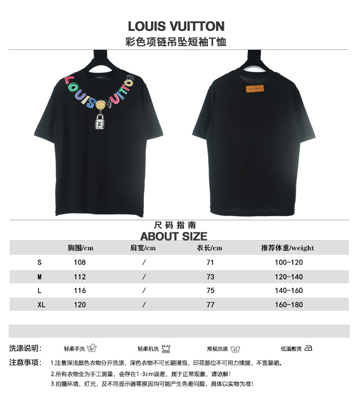 LOUIS VUITTON/路易威登彩色項鏈吊墜短袖T恤.男女同款全新美學靈感趣味設計,渠道性質精品.讓整體造型設計更加優雅時尚,今夏最火系列,無數明星潮人追捧.裁剪工藝細節處理工整為玩味時尚增添色彩!工整細致,合身的版型構造更是獨具匠心,上身不僅有著出彩的辨識度更是減齡青春.一款穿著意義還有穿搭性能都很極致的款式,絢麗的色系調配,此款的工藝必然也是極致非凡,上身的舒適度絕對足夠的強大,也是奢品本質的一種彰顯.柔軟輕薄,觸感更是極端撩人,透氣性能十分之強大,尤為適合春夏季節的穿搭所需,妥妥的穿著享受.並且各處的細節以及織帶的工藝都是盡善盡美,更顯高級感.