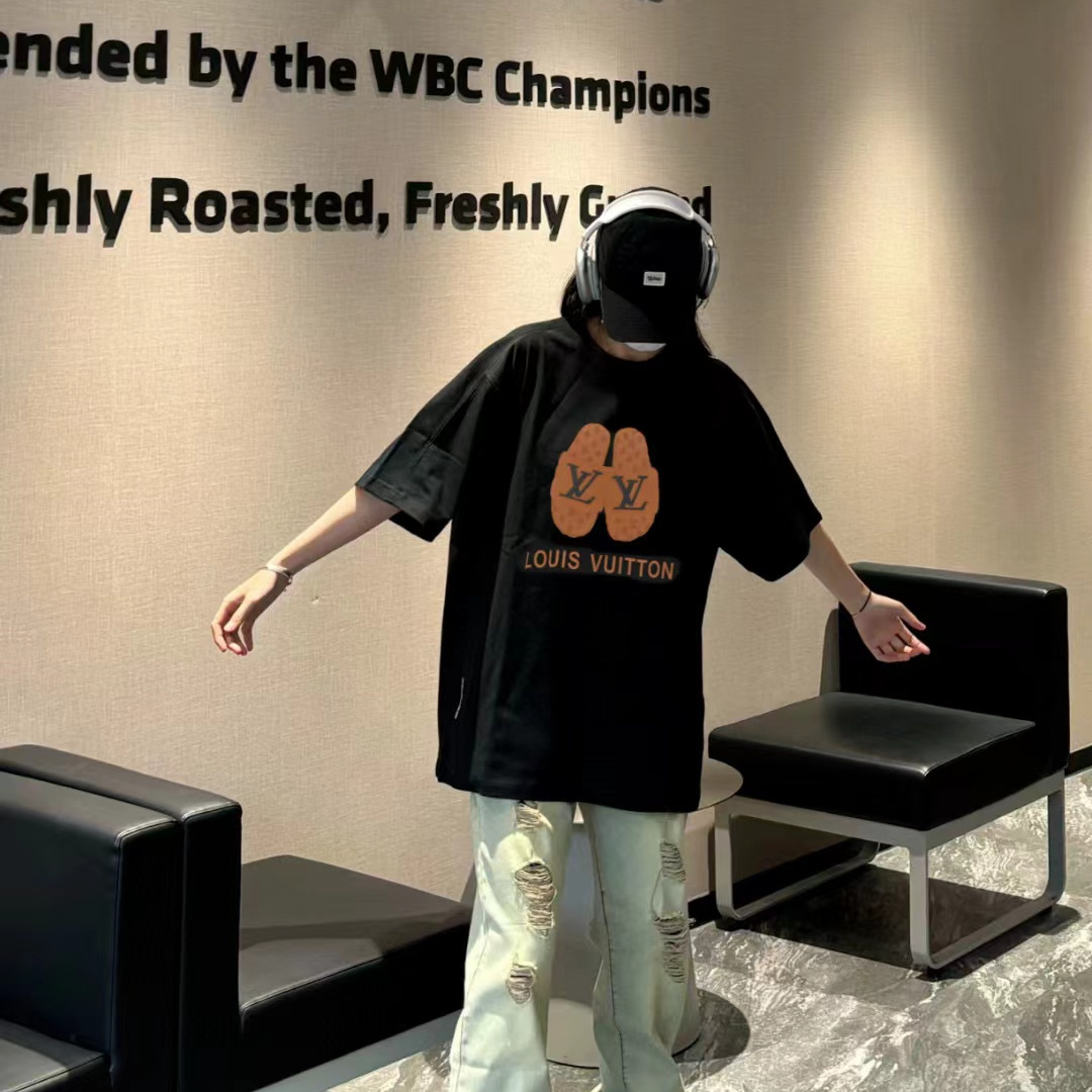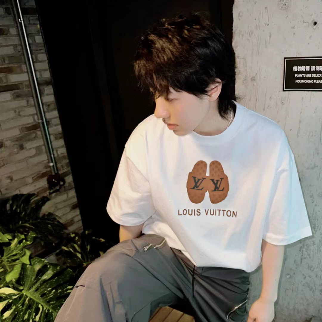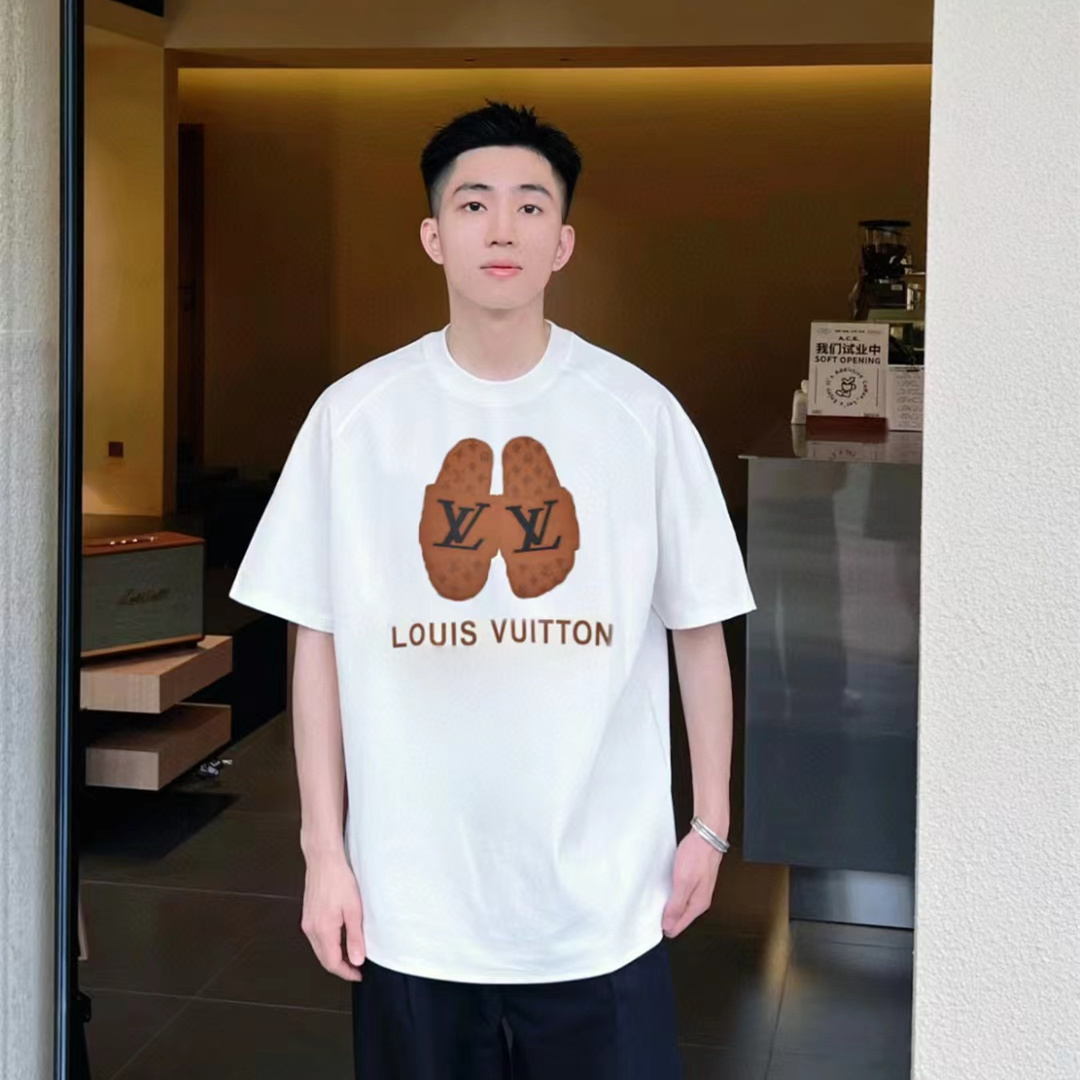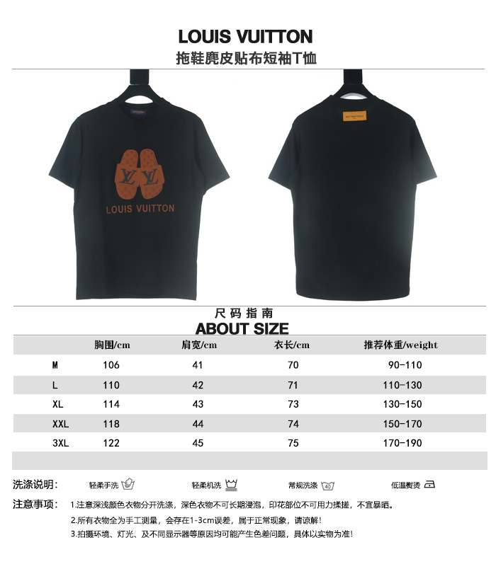 LOUIS VUITTON/路易威登拖鞋麂皮貼佈短袖T恤.胸前印花短袖採用60支雙股,270g全棉面料.上身透氣,絕不起球,手感柔軟舒適,全衣平車走線立體剪裁.胸前logo為刻字,非印花工藝.領口,下擺雙窄針平車.定制側標,輔料齊全,質感十足,全套定制還原最真實的百分百質感,訂制官網原版四標.