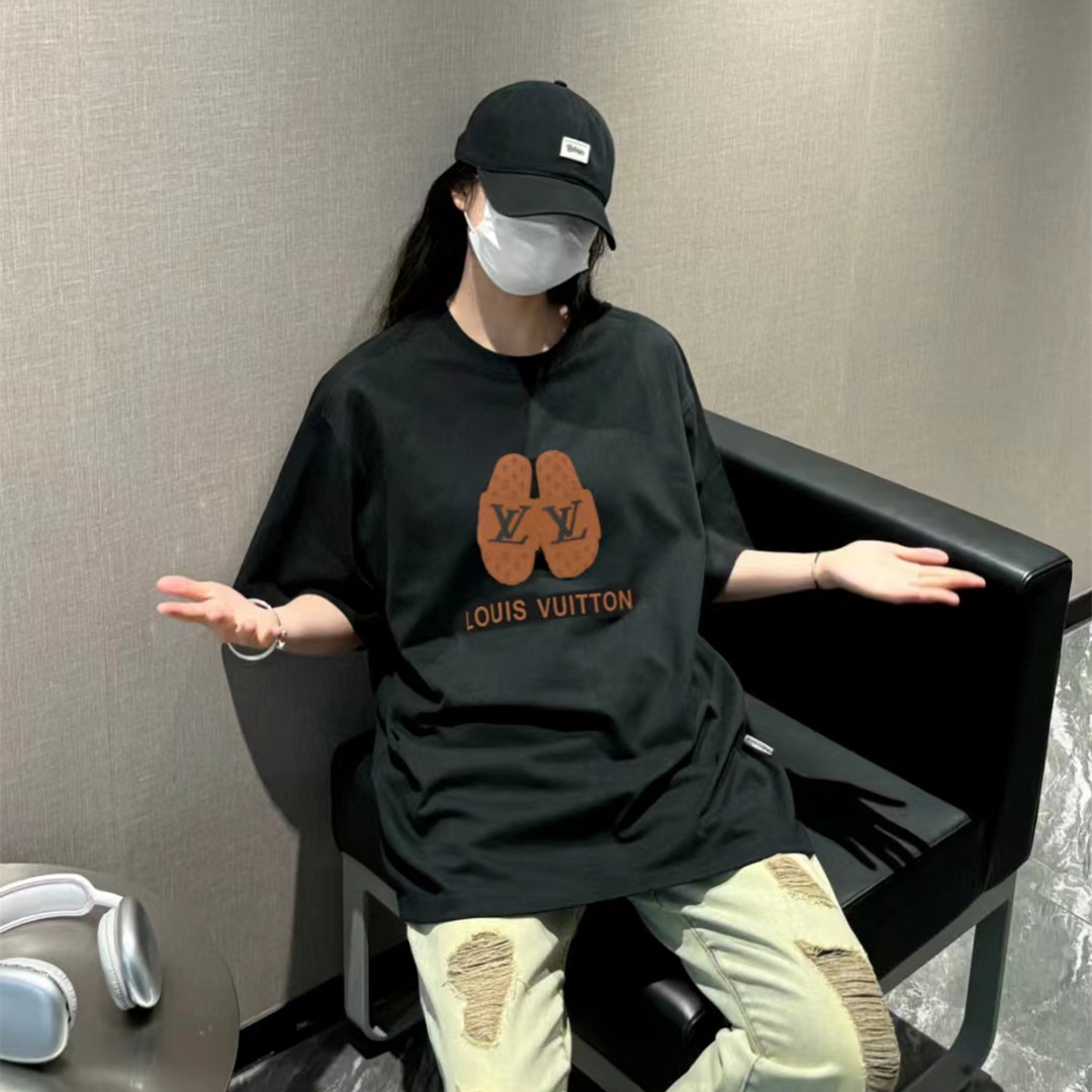 高仿LV*1AFR0040拖鞋麂皮貼佈T恤黑色