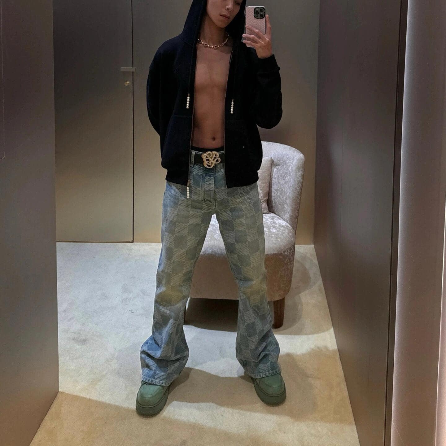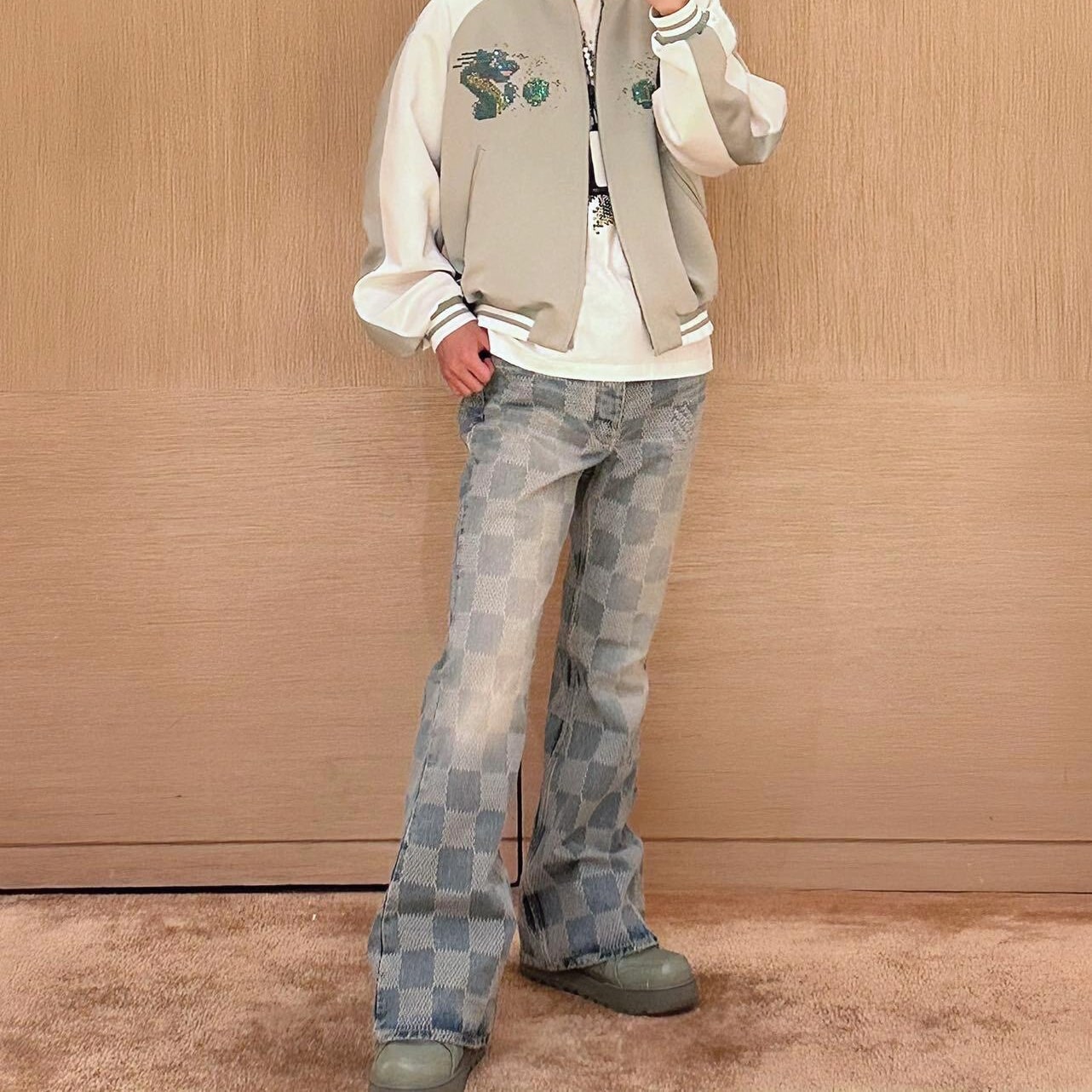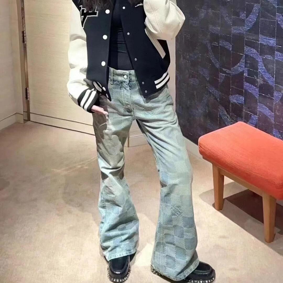 LOUIS VUITTON-DAMIER棋盤格喇叭牛仔長褲定織特殊提花工藝牛仔布,石磨酵麽技術,利用特殊浮石與牛仔服裝進行不規則摩擦,以呈現洗舊效果,多位馬騮技術,使用噴槍將高錳酸鉀溶液噴到牛仔褲上,發生化學反應使布料褪色效果.炒沙手擦技術,通過在炒沙機上進行處理,使牛仔褲表面產生自然的褪色和磨損,再純手工使用特制工具對牛仔褲表面進行物理損傷,寬松版型.