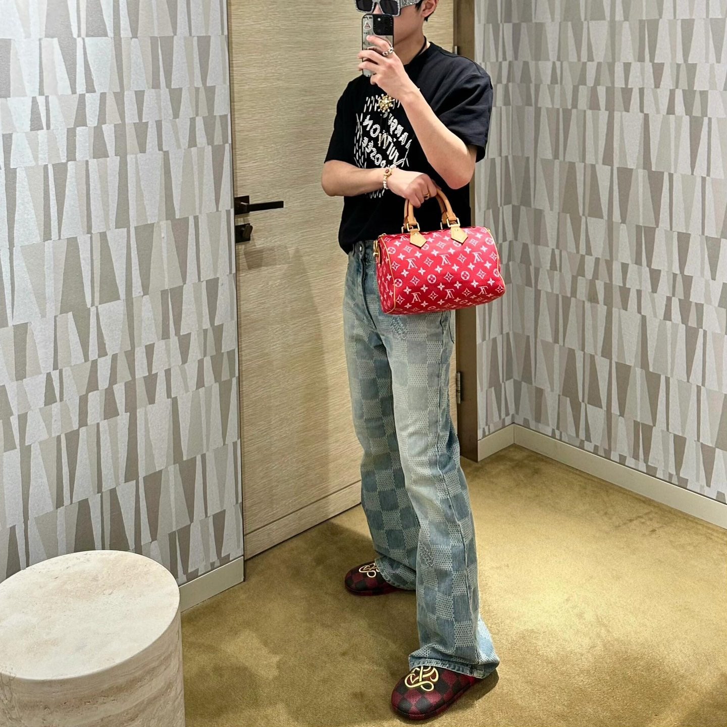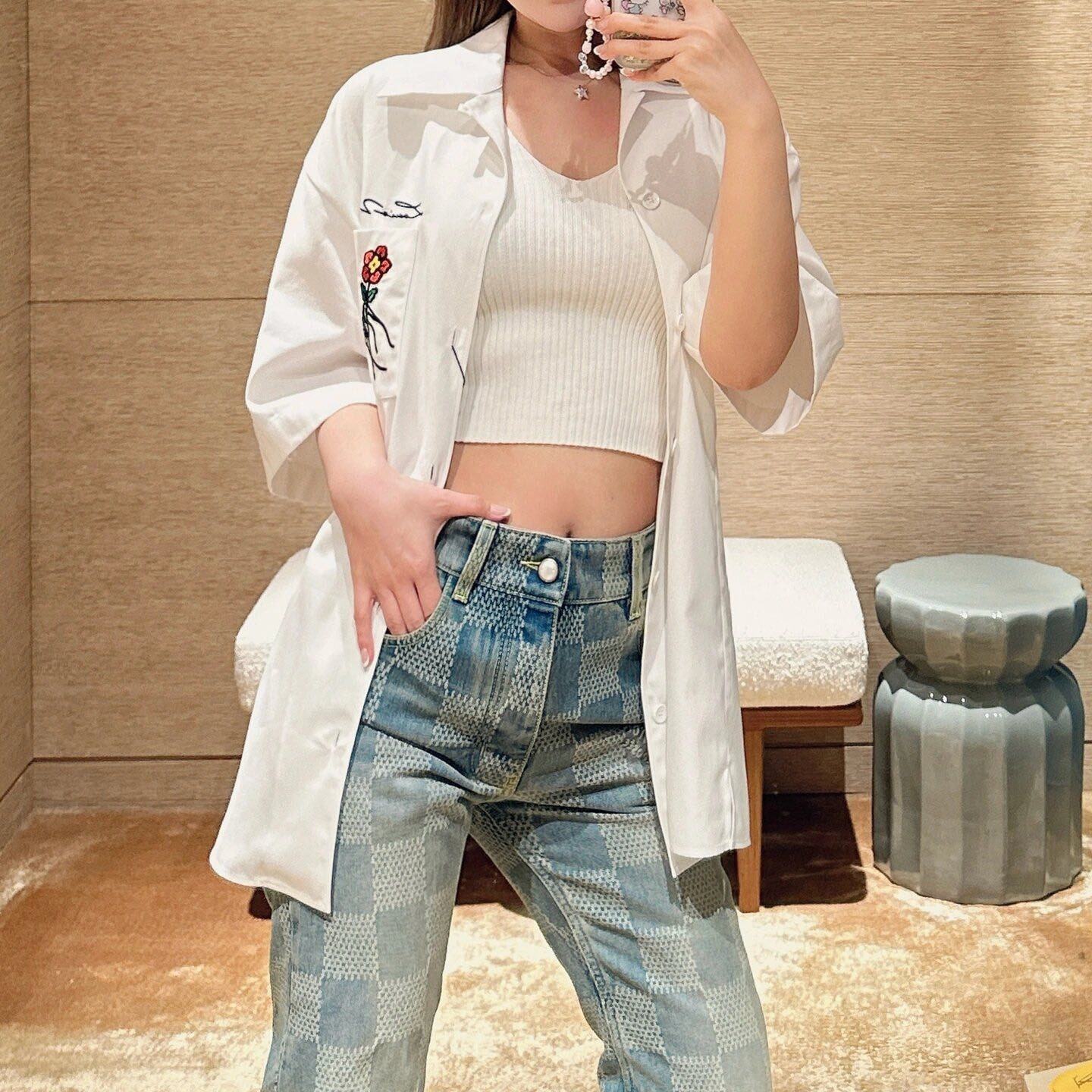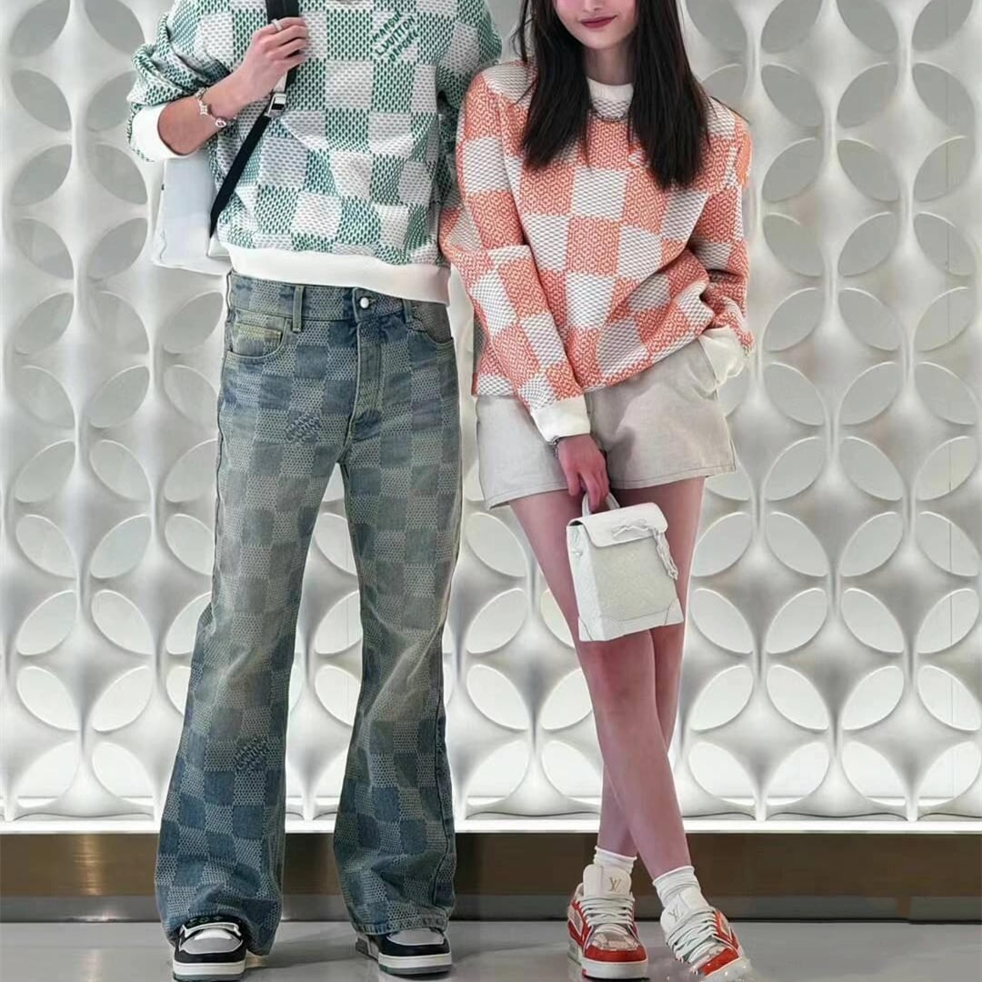 LOUIS VUITTON-DAMIER棋盤格喇叭牛仔長褲定織特殊提花工藝牛仔布,石磨酵麽技術,利用特殊浮石與牛仔服裝進行不規則摩擦,以呈現洗舊效果,多位馬騮技術,使用噴槍將高錳酸鉀溶液噴到牛仔褲上,發生化學反應使布料褪色效果.炒沙手擦技術,通過在炒沙機上進行處理,使牛仔褲表面產生自然的褪色和磨損,再純手工使用特制工具對牛仔褲表面進行物理損傷,寬松版型.